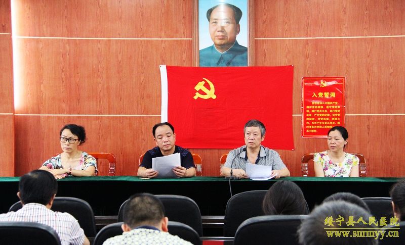 6月26日下午,我院开展“三严三实”专题教育活动迎接党的生日。全院60余名党员干部职工参加会议,院长龙健安主持会议。 为进一步贯彻落实各级党委对“三严三实”专题教育活动的安排部署,书记杨昌林紧扣“三严三实”主题,结合医院发展实际,只讲问题不谈成绩,从三个方面为参会人员讲授了专题党课:一是“三严三实”的丰富内涵,二是“三严三实”专题教育的重要性,三是开展“三严三实”专题教育的工作要求。他指出,践行“三严三实”是永葆共产党先进性、使我们党永不褪色的需要;是加强党的建设,加强党风廉政建设、加强作风建设的需要;是搞好我院各项工作,开创我院工作新局面的需要。要求班子成员要带头讲“三严三实”专题党课、要带头查找“不严不实”的突出问题,以开展专题学习研讨与专题民主生活会等形式,切实校正修身不严、用权不严、律己不严、谋事不实、创业不实、做人不实的问题,持续推进党的作风建设。 随后,院长龙健安强调,“有为才有位”,党员同志要时刻严格要求,带头做好三个模范:一是做遵纪守法的模范,二是做践行先进文化的模范,三是做加快医院发展的模范,以工作作风的改进与服务水平的改善来进一步提升社会满意度与美誉度,为我县卫生事业的发展做出新的更大的贡献。 会上一批预备党员在庄严的党旗下宣誓入党。 (编辑:黄铭培、付文娟)
