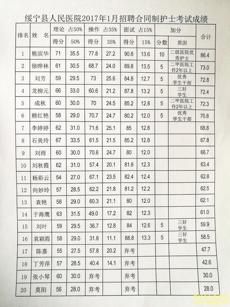 现将绥宁县人民医院2017年1月13日启动的合同制护士招聘考试总成绩公布如下,体检初步拟定2月14日左右进行,具体时间另行通知,请各位考生及时关注。