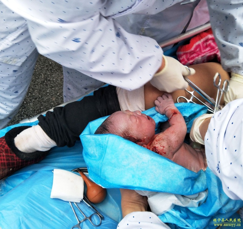 58分 小宝贝降生,医护们有序的予以断脐、吸痰、清理呼吸道,小宝贝发出来到这个世界后的第一声啼哭。天气阴冷,产妇与孩子被立即送进产房,在无菌条件下进行胎盘娩出、二次断脐及保温等后续处理。(林小莲摄)