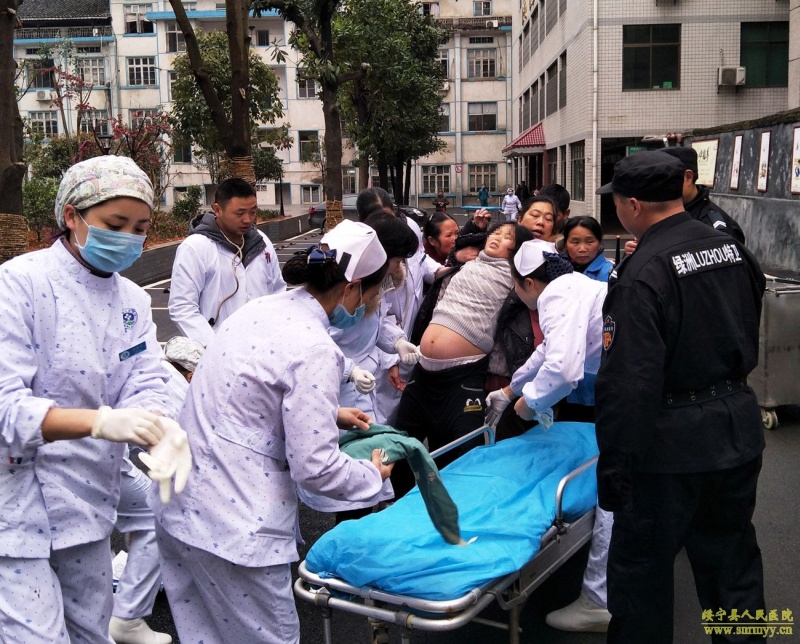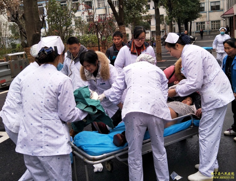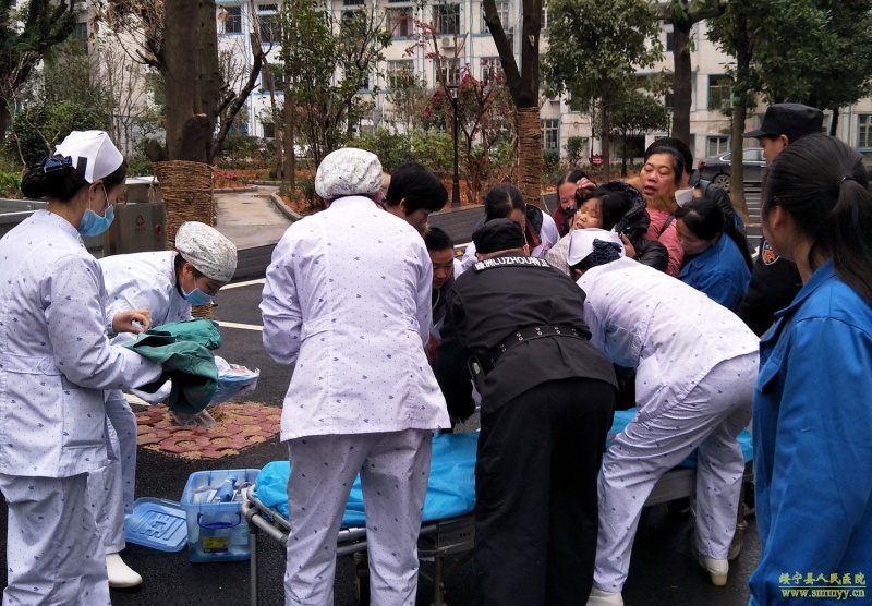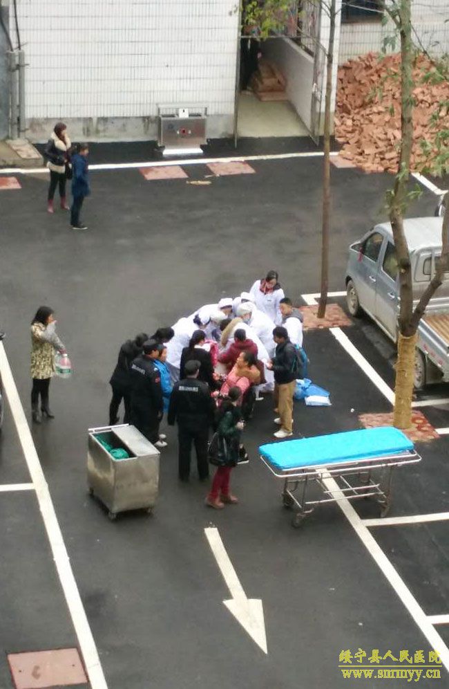 导读:2017年3月16日上午8点58分,麻塘产妇林女士在我院医护人员的帮助下于医院院内花园旁惊险产下一子,现母子平安。从接获通知,到完成接生,我们的医护人员仅用时5分钟。 8:51 “医生,医生,快来啊,有个孕妇在院子里快生了,孩子头都看到了,快来人啊。”一阵急促求救声由远及近,住院部一楼正在查房的儿科两位副主任邹娟、罗引医师立即抄近路往医院花园方向跑,才出过道就看到一位产妇在家人的搀扶下一动不动的站着,表情痛苦。“罗引,马上给妇产科打电话,孩子露头了。”邹娟看着产妇明显凸起的裤裆,边说边上前扶住婴儿头部。 8:53 “紧急情况,楼下院子里有个产妇正在分娩,孩子已露头,请周医师及助产士马上随我下楼。”挂上电话,妇科护士长袁红利边通报病情边拿出一直处于备用状态的接生箱,脚下生风的往楼下赶。 8:55 众人齐心协力将产妇抬上担架,原地紧急分娩。(林小莲摄)