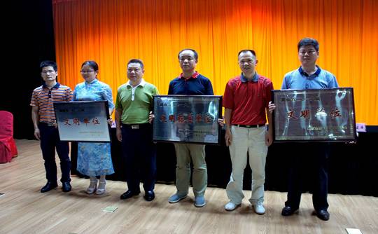 我院荣获“2016届省文明标兵单位”称号 近日,在绥宁县人民医院外科楼13楼会议室举行了“湖南省2016届省文明标兵单位”、“2016届省文明单位”授牌仪式。邵阳市委宣传部副部长、市文明办主任黄光荣,县文明办主任杨光联等领导,县属各文明创建单位以及医护人员共300余人参加了授牌仪式。 授牌仪式由绥宁县文明办主任杨光联主持,市文明办创建科科长周卫长宣读省委、省政府关于表彰绥宁县人民医院为“2016届湖南省文明标兵单位”及绥宁县民政局、县人民检察院为“ 2016届省文明单位”的决定。接着,市委宣传部副部长、市文明办主任黄光荣为上述表彰单位授牌。 授牌仪式后,市委宣传部副部长、市文明办主任黄光荣还为绥宁县开展“道德讲堂”讲座。此次道德讲堂活动在县人民医院、县食品药品工商质量监督管理局、县民族宗教和文体广电新闻出版局三个分会场举行。黄光荣作了《加强“四德建设”,引领社会文明》主题讲座,全县30多个省市级文明单位600多名干部职工聆听了讲座。 (编辑 铭培) 授奖会场 从左至右:县文明办主任杨光联、市委宣传部副部长、市文明办主任黄光荣、市文明办创建科科长周卫长、县人民医院院长龙健安。 会场一角 图为会场 市委宣传部副部长、市文明办主任黄光荣为绥宁县人民医院授奖。院长龙健安接奖“2016届湖南省文明标兵单位”。 被授予“2016届湖南省文明标兵单位”“ 2016届省文明单位”的绥宁县人民医院、绥宁县民政局、绥宁县人民检察院留影。 我院被授予“2016届湖南省文明标兵单位”。 奖牌证书。 《加强“四德建设”,引领社会文明》主题讲座现场。 图为《加强“四德建设”,引领社会文明》主题讲座现场。