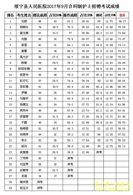 绥宁县人民医院2017年9月合同制护士招聘考试成绩查询