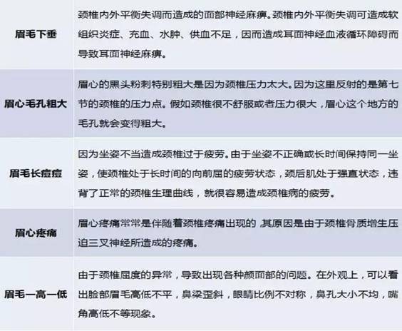 眉毛异常脱落还有可能是颈椎偏位。由于偏位的颈椎压迫了神经根,引起大脑神经系统、血液供养系统的供给不足,使供给身体毛发的营养受到阻碍,产生眉毛脱落现象,同时也可伴有脱发现象的发生。 眉毛的中间眉心位置是第七节的颈椎的一个压力点,如果颈椎出现了问题就会通过这个压力点反应到眉毛上。因此,如果颈椎出现问题基本上是可以通过眉毛来判断的。 除了眉毛脱落,眉毛下垂、眉心毛孔粗大、眉毛长痘痘、眉心疼痛、眉毛一高一低等其实也和颈椎有关系。