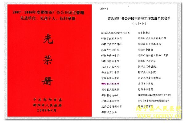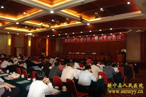2009年5月26日下午3时,邵阳市厂务公开民主管理工作会议在邵阳和一宝庆山庄一号会议室召开。我县县委常委、纪检书记赵逢春、县总工会领导及我院院长龙健安同志参加了此次大会。市政府领导在会议上做了重要讲话并进行了颁奖,我院获得了2007—2008年度邵阳市厂务公开民主管理工作先进单位。这是我院第三次连续获得厂务公开民主管理工作先进单位。