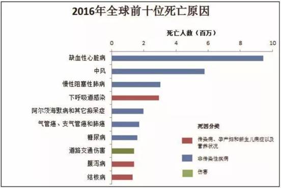 全球十大死因发布!看看最威胁你的是哪个! 据世界卫生组织(WHO)最新统计数据显示,2016年全球死亡人数共5690万,其中54%缘于10大原因,占死亡总数半数以上!