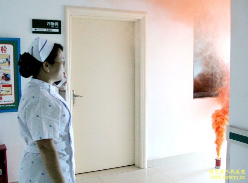 下午2:30,烟雾弹开启,外科楼12层泌尿外科发生“火情”,浓烟弥漫,护士长立即电话报警,火灾警报拉响,模拟演练开始。
