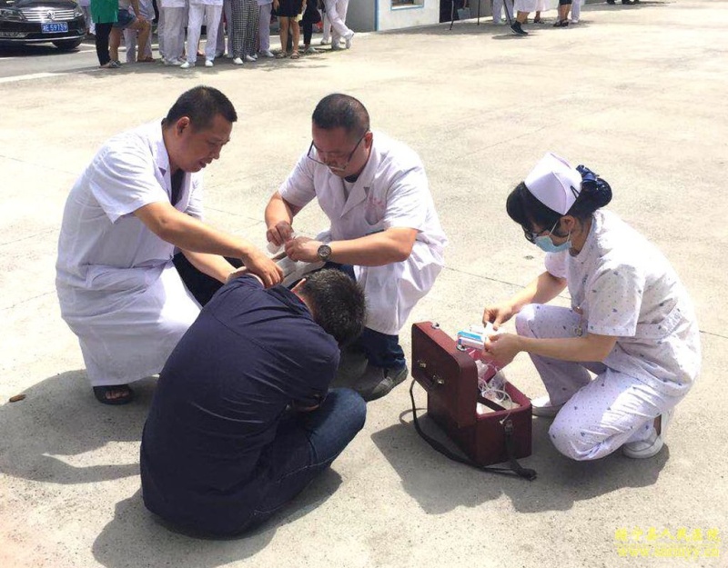 医疗救护小组对在火灾中负伤人员进行伤口包扎和输液救治,疏散演练圆满完成。