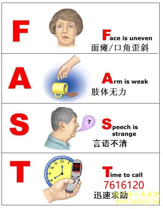 一旦家人发生脑卒中,切莫慌张,可通过上图所示进行判断,立即采取以下措施: 1.单独出现或同时出现多个脑卒中症状时,要立即拨打急救电话 “7616120”迅速求助。 2.解开患者衣领,如有假牙也应取出,使患者仰卧,头肩部垫高,呈头高脚低位,以减少头部血管的压力;将头偏向一侧,以防止痰液或呕吐物引起呛咳,或回吸入气管造成窒息。如果患者口鼻中有呕吐物阻塞,应设法抠出,保持呼吸道通畅。如患者未清醒,切忌盲目给患者喂水或饮料。 3.在没有医生明确诊断之前,切忌给患者服用药物,如止血剂、安宫牛黄丸等,也包括平时服用的降压药,防止加重病情。 4.脑卒中患者早期处理一刻千金,必须分秒必争,不要延误抢救时间。 温馨提示:在整个运送过程中家属最好尊重急救医师的建议。(编辑 雅玲) |