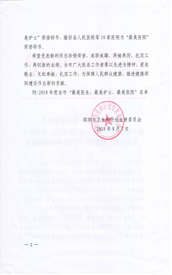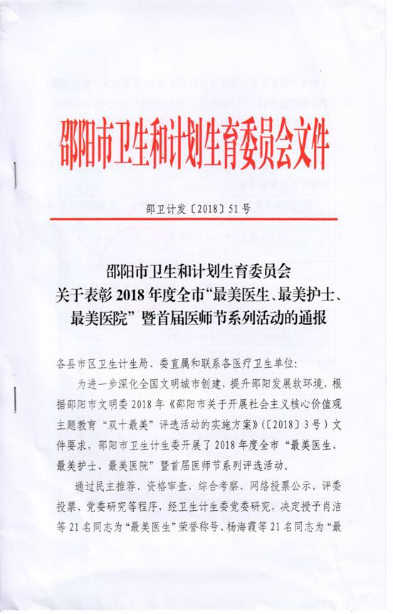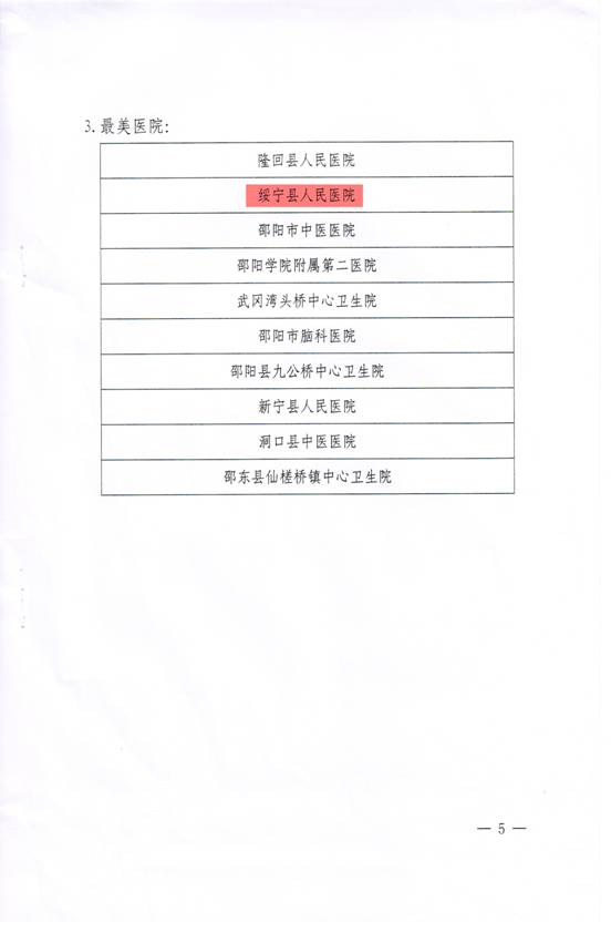 首届邵阳市“最美医院、最美医生、最美护士”评选活动揭晓 我院喜获邵阳市“最美医院” 为进一步深化全国文明城市创建, 有效提升邵阳发展软环境,树立和表彰医院建设行业的先锋模范,根据邵阳市文明委2018年《邵阳市关于开展社会主义核心价值观主题教育“双十最美”评选活动的实施方案》(〔2018〕3号)文件要求,邵阳市卫生计生委开展了2018年度全市“最美医生、最美护士、最美医院”暨首届医师节系列评选活动。通过民主推荐、资格审查、综合考察、网络投票公示、评委投票、党委研究等程序,经市卫生计生委党委研究,由我县报送的绥宁县人民医院“杏林春色满绿洲”荣幸被评为邵阳市首届“最美医院”。 首届邵阳市最美医院评选作为重要评选项目,旨在从医院建设的角度选出医院建设成果的典范,有效提升医院现代化管理和建设水平,实现医院现代化建设的跨越式发展。市卫生计生委充分借助“互联网+”线上优势,6月26日在微信平台启动,至7月2日结束,共有21个医院参与其中。本次评选参与面广、关注度高,经过各医院展示、公众互动投票、市卫生计生委综合评定等环节,最终10个“最美医院”脱颖而出。 一直以来,绥宁县人民医院始终牢记“仁爱、敬业、奉献、创新”的院训,致力于通过总体规划布局、细部设计、景观设计与亮点特色及改善就医体验与医院管理,为百姓打造一所高精尖、人性化、现代化的二级综合性公立医院,医院投资引进各类先进智能化设施设备,不断完善医疗服务流程,创新医疗模式,力求成为一所“科技、人文、生态”并重的智慧型医院。这次评选活动的开展,不但充分展示了我院奋进的精神风貌,还有效检验了绥医人的凝心聚力和全情投入,激励大家不忘初心,继续前行。 本次“最美医生、最美护士、最美医院”评选活动,我院神经外科护士长袁菊荣位列其中,获得“最美护士”荣誉称号。 邵阳市卫生和计划生育委员会关于表彰2018年度全市“最美医生、最美护士、最美医院”暨首届医师节系列活动的通报 10家邵阳市“最美医院” 下面,请跟随我们的视角,来看看美不胜收的魅力绥宁县人民医院吧! 绥宁县人民医院在十几年的发展中,以其杰出的管理和优美宜人的院区环境成为邵阳现代医院建设的典范。这十几年,绥宁县人民医院实施了一系列基本建设项目,这些建设使整个医院旧貌换新颜。
