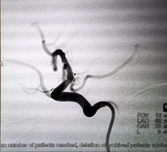 7月26日,在中南大学湘雅医院神经外科沈沉浮主任的指导下,绥宁县人民医院圆满完成县内首例经股动脉穿刺全脑动脉造影+颅内动脉瘤栓塞术,该手术难度为四级(最高等级),标志着我院在脑血管疾病治疗又迈上了一个新的台阶。 患者女性,54岁,因突发头痛4小时入院。入院查体:神志清楚,四肢肌力肌张力基本正常。经头部CTA诊断为蛛网膜下腔出血、左侧颈内动脉后交通段动脉瘤。 颅内动脉瘤被神经外科医生称为颅内的“定时炸弹”,由于其破裂后的死亡率极高,介入治疗颅内动脉瘤是一项对技术和材料要求极高的微创手术,创伤小、恢复快,是目前治疗颅内动脉瘤的重要手段,这种争分夺秒的手术不允许术者有毫厘差错,术者必须要有足够的自信和心理承受能力。 脑卒中起病急,病情凶险,时间就是大脑,时间就是生命。专家团队得知其病情后,为患者做了详尽的检查后确定可以可以进行该类介入手术,并制定了周密的手术计划。 术前VS术后 绥宁县人民医院神经外科黄敏主任、大外科党支部书记、麻醉科主任陆居兵,放射科苏增武医师、麻醉科颜志鹏医师在中南大学湘雅医院神经外科沈沉浮主任的指导下,予患者在全麻下经右侧股动脉穿刺,造影后可见左侧颈内动脉末端有大小约3*4*3mm动脉瘤,选取合适角度路径图引导下,取支架导管在微导丝引导下,将微导管头送入动脉瘤内,退出微导丝,经微导管填入4枚弹簧圈,造影显示稳定,动脉瘤已致密填塞,再将支架完全释放;将6F导管退出到达左颈总动脉分叉下段进行造影,见左侧大脑前、中、后及脉络膜前显影良好,无动脉夹层,退出导管后,压迫止血,包扎伤口。术毕,手术顺利,术中出血约10ml,患者安返ICU。 这是绥宁县人民医院介入治疗的又一创举,这一技术的的成功开展应用,为今后进一步开展脑血管病介入手术治疗奠定了基石,让脑血管疾病的患者有了更多的治疗选择,真正实现了“大病不出县” 的医改目标和要求。 |