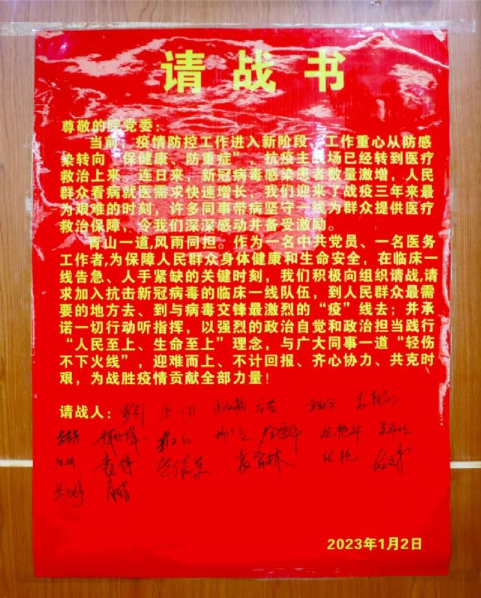 动员会后,行政后勤岗位医务人员主动签下请战书,时刻准备着听从指挥、奔赴临床一线,为守护人民群众身体健康和生命安全贡献一份力量。当天,行政后勤岗位医务人员响应号召,积极投身临床一线。 为积极有效应对本次就诊高峰,行政和临床紧密配合打出防疫“组合拳”,全院职工以高度的责任感和使命感挺身而出,坚决服从指挥,充分发挥医者仁心、甘于奉献的精神,全力以赴保障人民群众就医需求。 |
