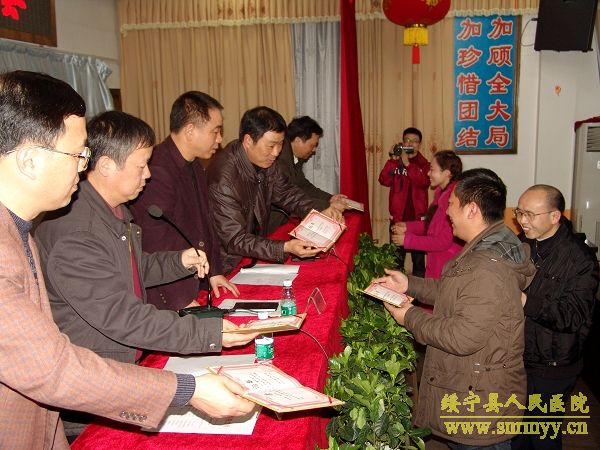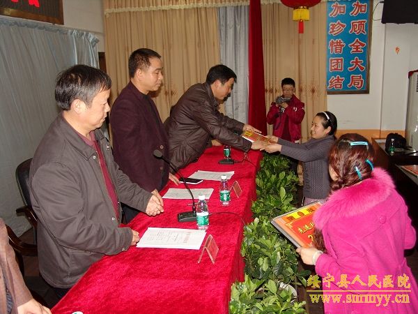 随后,杨昌林书记宣读了医院表彰先进科室和优秀个人的文件。放射科、妇产科、内一可、急诊科、护理部感染办被评为先进科室;内三科、检验科、外一科荣获“安全奖”;小儿科、功能科、外二科荣获“效益奖”;小儿科、急诊科、外二科分别荣获“护理目标管理”一、二、三等奖。于合意 陈配桄、李永顺、阳志雄、龙运军、刘霞等六名同志荣获“论文奖”;38名员工被评为优秀个人。院领导班子为先进集体和优秀个人颁了奖,寄望获奖科室和同志珍惜荣誉,再接再厉,再立新功。