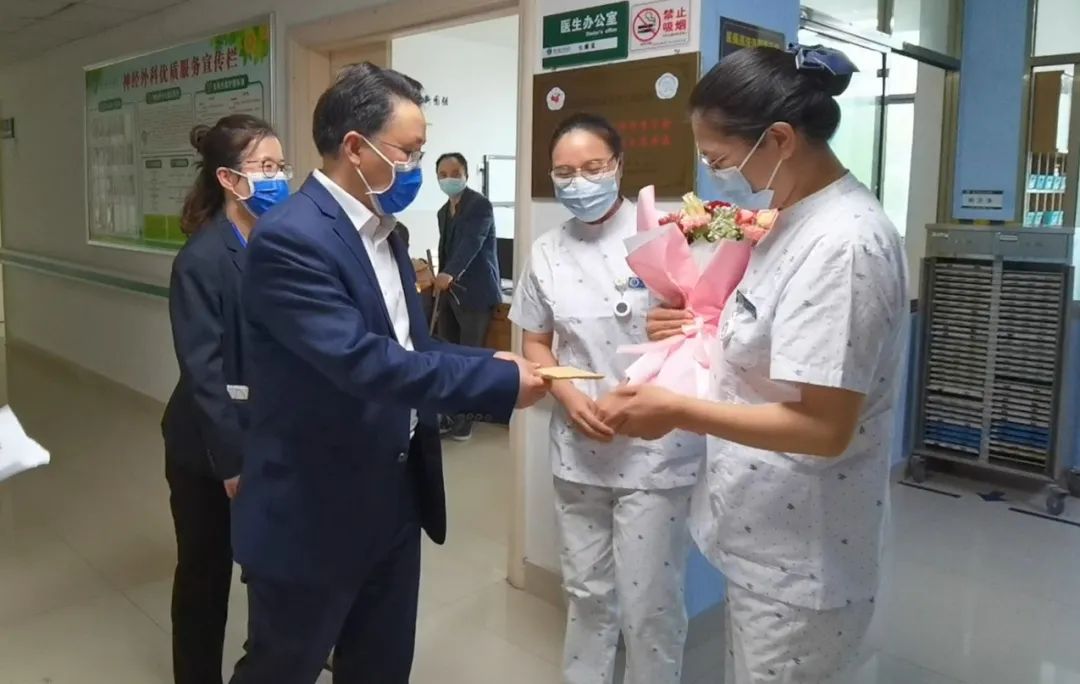 节日当天,整个医院都弥漫着甜蜜和幸福的味道,绥宁县人民医院领导班子也分别带队走进临床各科室,慰问一线护理工作者,为她们送上鲜花、慰问金,致以节日的祝福,并勉励全体护理工作者不忘初心、牢记使命,继续传承和发扬南丁格尔精神,不断丰富护理内涵,提升护理队伍整体素质,以精湛的技术、优质的服务和神圣的使命感为医院高质量发展作出新的更大贡献。 一声声祝福,一束束鲜花,传递的是温暖和鼓励,也是属于绥医人的甜蜜与情谊。“天使们”在祝福和问候中暖意融融,十分感谢县领导及院领导的关心关爱,并表示将继续发扬南丁格尔精神,勇担白衣使命,立足岗位持续奉献光和热,持续做好护理工作,为人民群众提供更加优质、高效与安全的护理服务。