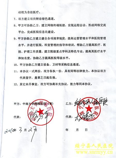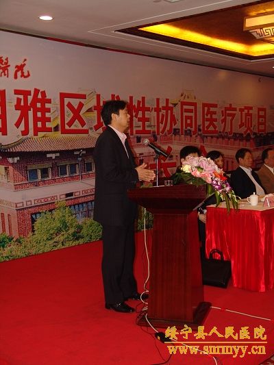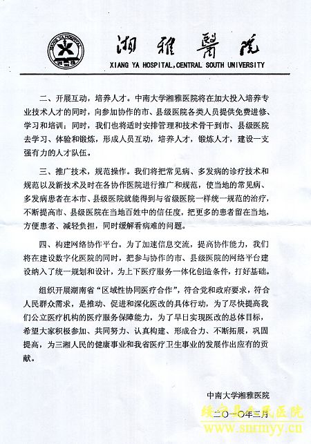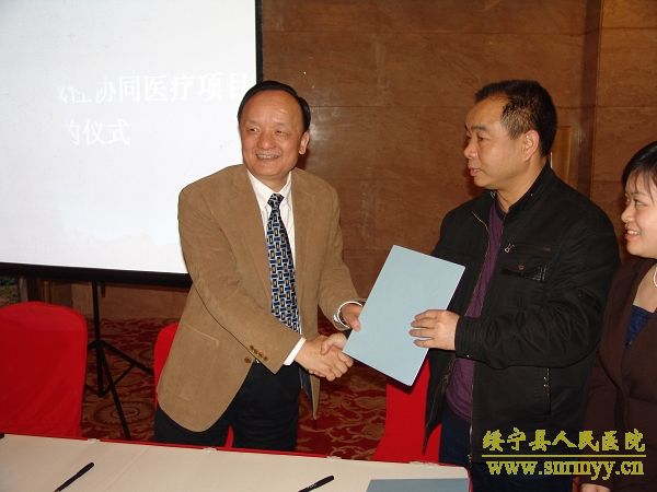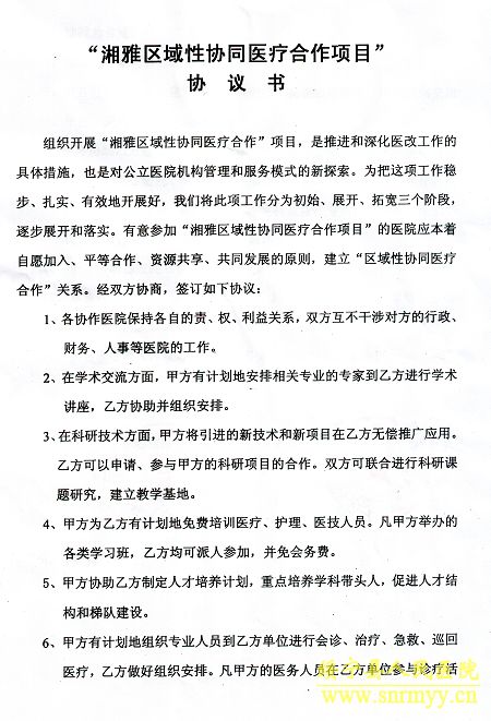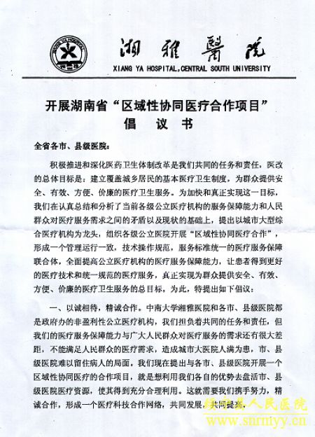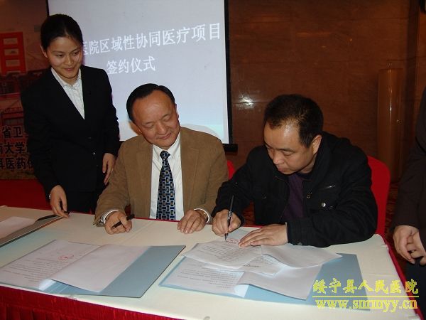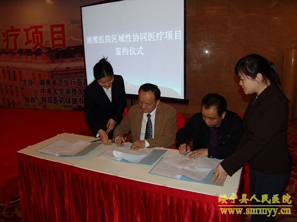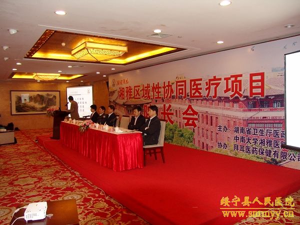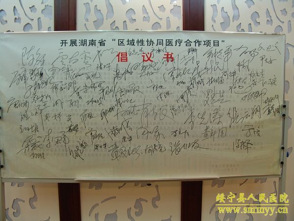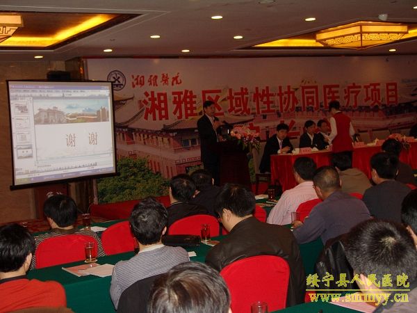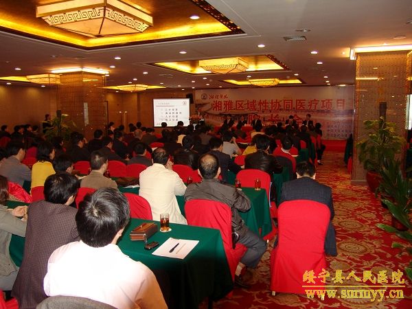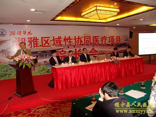 2010年3月27日,湘雅“区域性协同医疗”项目暨院长会议在长沙潇湘华天大酒店召开。来自一百多家县级医院院长参加了会议。我院院长龙健安出席了此次大会,并参加了湘雅 “区域性协同医疗”合作项目签字仪式。