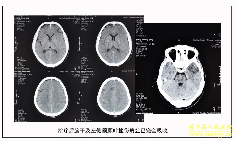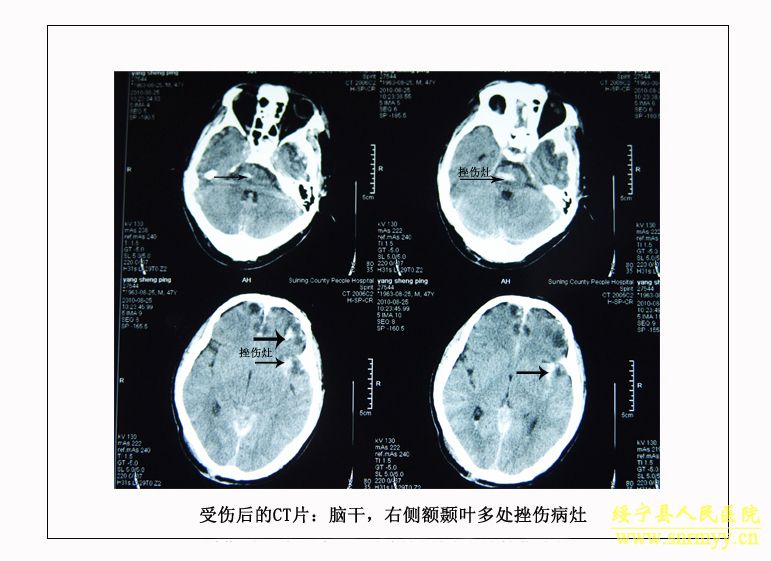 经检查:当时病人体温36.5℃、脉搏105次/分钟、呼吸25次/分钟、血压152/98mmhg,呈昏迷状,头面部、右手、左下肢均不同程度受伤,双侧瞳孔不等大,光反射消失;同时右手臂和左大腿均有骨折。GCS评分:仅4分,根据评分标准(轻度颅脑损伤为12—15分、中度为8—12分、重度为5—8分、极重度为3—5分)该病人属于极重度颅脑损伤。CT检查结果为脑干挫裂伤、双侧额叶、左颞叶、右顶叶脑挫裂伤、左侧颞部硬膜外、下血肿,左顶硬膜下血肿,蛛网膜下腔出血,脑室内积血,左侧额部下积液,左眼框内侧壁,枕骨骨折。X光片显示右桡骨粉碎性骨折,左股骨干骨折。诊断为:1、极重度颅脑损伤:(1)脑干挫裂伤。(2)双侧额叶、左颞叶、右顶叶脑挫裂伤。(3)右颞部硬膜外血肿。(4)外伤性蛛网膜下腔出血。(5)枕骨骨折。(6)头皮多处挫裂伤。2、右桡骨粉碎性骨折。3、左股骨干骨折。临床上如此严重的脑损伤死亡率极高,再加上合并多处骨折创伤,病人危在旦夕。