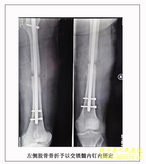 经再次检查,病人的身体状况明显好转,但意识模糊。9月28日,病人意识逐渐清楚。为方便护理,让病人早日康复,由沈建辉副院长亲自主刀,刘兴淼医师为助手,为病人实施了左股骨开放复位和交锁髓钉内固定术。10月21日,病人生活基本能自理,近日即可出院。  (2010.10.26)
