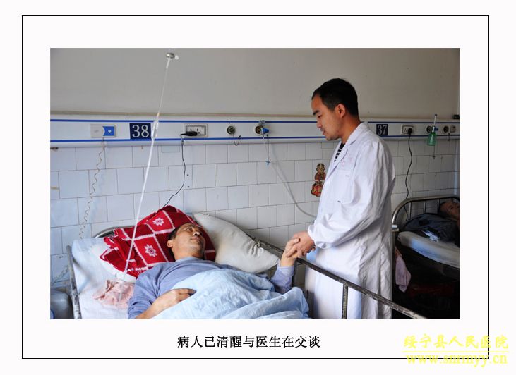 危急时刻,分管副院长沈建辉当即通知外二科、手术室医师全力做好抢救准备,并针对病人伤情讨论了救治方案,统一意见后,立即将病人送入手术室进行缝合、止血、气管切开等一整套手术,同时积极用药以降低颅内压、颅内出血、抗感染防治并发症、保护脑神经等对症支持治疗。在外二科全体医护人员的精心治疗和护理下,同死神搏斗的病人终于闯过了道道难关,脑水肿危象度过了,肺部感染控制住了。二十天后(9月14日),病人终于睁开了眼睛。