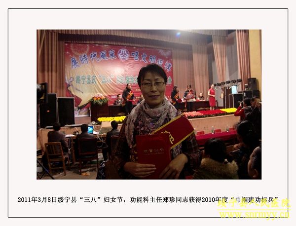 2011年3月8日,由绥宁妇联主办的“庆三八表彰大会”在绥宁电影院隆重举行,大会分为“表彰”和“文艺汇演”两部分,我院功能科主任郑珍同志荣获2010年度“巾帼建功标兵”荣誉称号。 郑珍,女,中共党员,衡阳医学院临床医疗专业毕业,大专学历,B超副主任医师。2001年至今任功能科主任;2005年被聘任为邵阳市医学会超声医学专业委员会委员;2006年当选为中共绥宁县第十次党代会代表,同年荣获县政府授予的“绥宁县卫生专业技术人员特殊贡献”奖;2007年当选为中共绥宁县第十五届人大代表,并荣立三等功;2006年和2007年被医院党总支评为优秀共产党员;2008年、2009年、2010年连续三年荣获县内嘉奖。