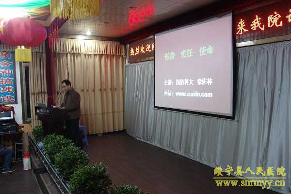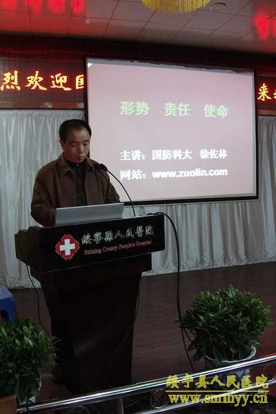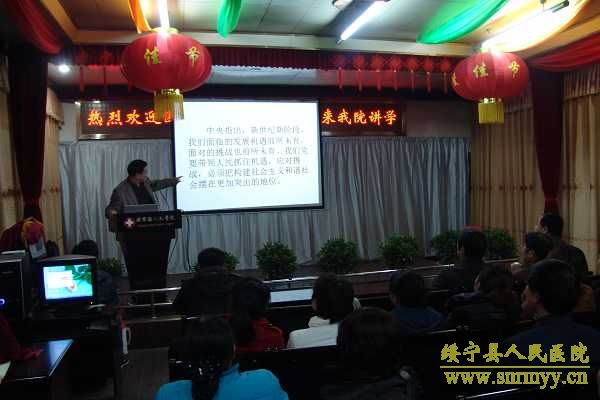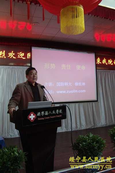 3月15日晚上七点,我院特邀国防科技大学著名演讲师徐佐林教授举办了题为“形势、战略、使命”的爱国主义专题演讲。全院体职工聆听了这场生动的理论指导和形势教育课。 徐佐林是国防科大经济学教授,中华教育艺术研究会理事,湖南省演讲学会副秘书长。1990年以来,他义务宣讲爱 国主义,走遍全国20多个省市演讲2500多场次,听众达100多万人次,主讲时政、思想教育、企业文化等,报告深刻感人,被誉为“鼓舞斗志的精神食粮,陶冶情操的艺术享受”。《解放军报》、《光明日报》、《湖南日报》等媒体多次报道演讲事迹。1991年被评为广州军区先进个人,2002年获“军队院校育才奖”。其人其事还被收录于《神州之魂》、《21世纪人才库》等大型书刊。 当晚,徐佐林教授以其机智幽默的语言、独特个性的风格和饱满激昂的热情,对当前的国际形势以及在此形势下我国的发展战略、当代青年应该肩负的责任和使命等方面进行了深入、精辟、幽默的阐述。他的讲座深入浅出,生动诙谐,贴近生活,且注重与听众的交流、互动,十分精彩。讲座自始至终深深吸引了与会者,大家听得津津有味,会场里不时发出阵阵会心的笑声。轻松愉快、易懂、易记的政治学习,对提升我院职工的政治思想素质有很大帮助。 特别是针对 当代青年的神圣使命、奉献、认真,他指出:只有认真才能把事做成,只有用心才能把事做精。同时,还结合医院工作实际,就树立责任意识、增强使命感的重要性进行了详细阐述。指出医院的所有工作都离不开三个词:认真、带头、意识。徐教授劝诫广大职工要认清发展的形势,牢记肩负的使命,明确自身的责任,攻坚克难抓好工作落实,全力以赴促进医院的跨越式发展。 院长龙健安主持讲学会