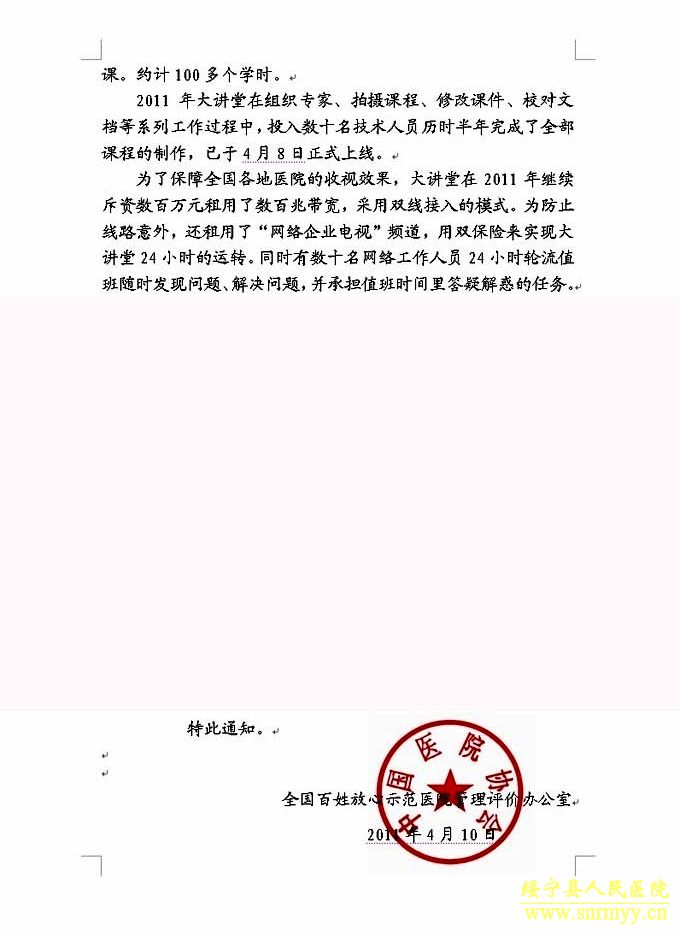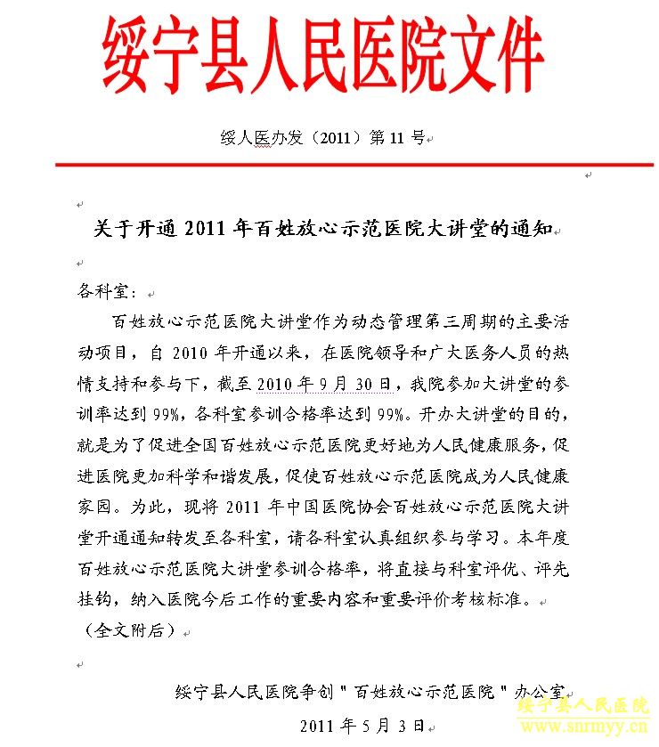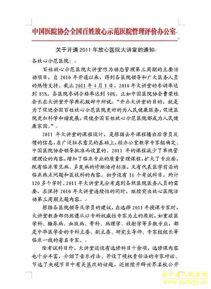 从2010年起,全国百姓放心示范医院创建活动进入第三周期动态管理周期。按照示范医院创建的“利国、利民、利院、利患”和“安全、质量、服务、费用”双八字核心方针重点及为促进医院全面建设与和谐发展的服务宗旨,紧密结合卫生部的重点工作,中国医院协会制订了全国百姓放心示范医院动态管理第三周期考核评价方案和评分标准。自2010年开通以来,在医院领导和广大医务人员的热情参与下,截至2010年9月30日,我院参加大讲堂的参训率达到99%,各科室参训合格率达到99%。开办大讲堂的目的,就是为了促进全国百姓放心示范医院更好地为人民健康服务,促进医院更加科学和谐发展,促使百姓放心示范医院成为人民健康家园。(全文附后)