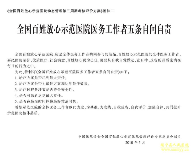 落实“全国百姓放心示范医院医务工作者五条自问自责”(详见附件二)
