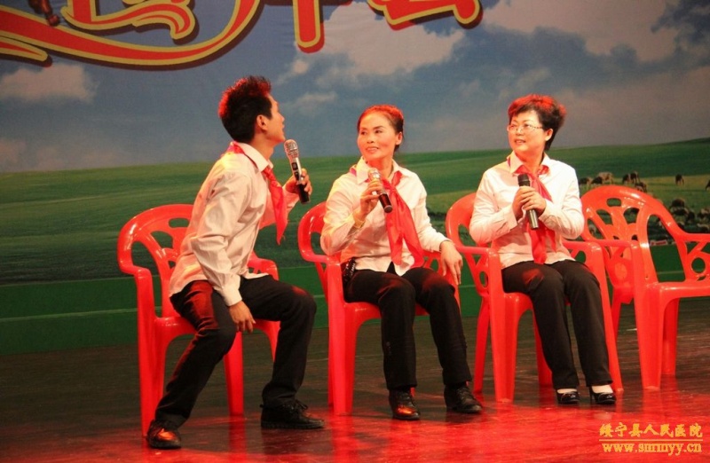 晚会现场 内四科、门诊部的精英们为大家带来的歌舞:《山丹丹开花红艳艳》。领唱者成培坽一袭红色衣裙,身材修长,风韵俨然,她那妩媚委婉、高低自如的歌唱,果然悦耳,通过一串串的音符,把“和睦、和美、和顺、和谐”的美好篇章,丝丝缕缕地漫浸观众的心底。