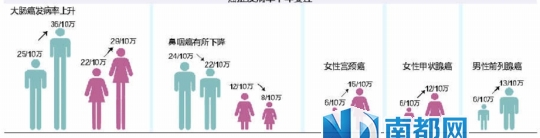 癌症统计信息 原标题:穗每年死亡市民1/4因癌症 从今天开始,又进入到一年一度的国家肿瘤宣传周当中。记者昨日从广州市疾控中心、广州肿瘤和死因监测部门获悉,根据最新一期的统计显示,目前广州市民的癌症发病率已上升到248/10万,死亡率144/10万的水平。 广州市800万户籍居民中每年新发癌症病人2.2万人,0-74岁居民累积发病率为22%。户籍居民因癌症每年死亡约1.2万,癌症死亡占全死因的25%。而广东省疾病预防控制中心表示,广东省的肿瘤发病率比全国整体水平高出23.5%;死亡率比全国整体水平高出7.5%。广东每死亡5人,就有1人死于癌症。 广州7个癌肿发病率位居全国前列 据悉,目前广州市疾病预防控制中心公布了最新的全市恶性肿瘤监测数据。全市发病率达到248/10万,死亡率144/10万,其中市区居民癌症发病率和死亡率更高,发病率达到313/10万,死亡率达到181/10万。 统计显示,在所有癌症中,肺癌和乳腺癌分别是男女性首位发病肿瘤,肺癌是男女性共同首位死亡肿瘤。与国内其它城市相比,广州的大肠癌、鼻咽癌、卵巢癌、乳腺癌、前列腺癌、淋巴瘤和白血病发病率相对较高,这七个癌肿发病率各自均位列全国31个肿瘤登记城市前五位。 大肠癌上升幅度较大,鼻咽癌略降 统计显示,近10年来,广州市部分恶性肿瘤发病率变化较大。恶性肿瘤的疾病谱出现了改变。比如大肠癌发病率男女皆有上升,分别上升了44%和32%;女性宫颈癌上升了150%,女性甲状腺癌上升了100%;而男性前列腺癌上升了117%。鼻咽癌则男女分别下降了8%和33%。 据专家解释,癌症发病率增加最主要原因是城市人口老龄化和居民生活方式改变,尤其是对于与生活方式密切相关的疾病。大肠癌和前列腺癌的发生与膳食结构偏重多肉类、高脂肪、高蛋白,但膳食纤维少密切相关。宫颈癌的发病率上升跟H PV (人乳头瘤病毒)感染有密切关系。 癌症患者生存率明显提高 尽管广州市癌症发病率保持上升趋势,但由于诊断和治疗技术的进步,癌症患者生存期限明显延长,相对死亡率下降了。如估计市区居民1980年的发病率约160/10万,2010年约313/10万,上升了196%,而1980年的死亡率为114/10万,2010年死亡率达到181/10万,只上升了59%。因此现存癌症病例会越来越多,现全市生存各种癌症患者约6.5万人。 广州市疾控中心肿瘤和死因监测科科长林国桢表示,研究表明,参加癌症筛查能够及早发现早期病变。目前,广州在国家重大公共卫生项目支持下,越秀、天河、黄埔和增城四个区县约15800名40-69岁常住居民中开展了针对目前五种高发癌症[肺癌、乳腺癌、肝癌、大肠癌和上消化道癌(包括食管癌和胃癌)]的筛查工作。 据悉,四区的五癌免费筛查工作中,发现的肿瘤绝大多数都是早期,而良性结节或癌前病变的大量检出并治愈可以在很大程度上减少进一步癌变的数量。“参加筛查可以尽早发现病变,并通过手术治愈,能大大减轻由于治疗中晚期癌症而给家庭造成的沉重经济负担”。 (采写:南都记者 王道斌 万蜜 实习生 陈梦琪 涂畅 通讯员 粤康信) |