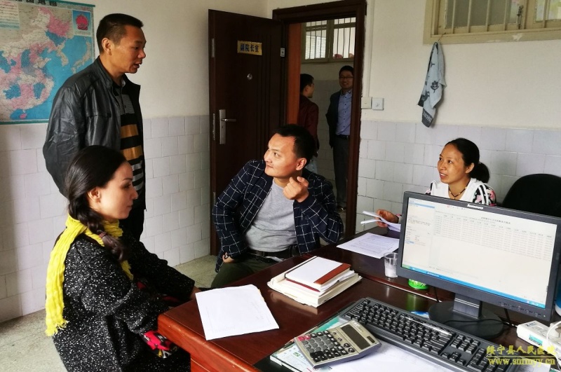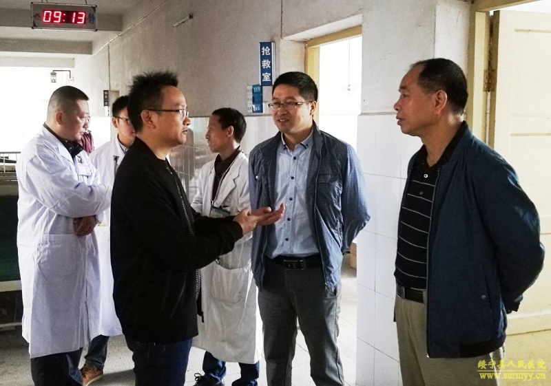 武阳分院院长肖正全(右四)向县卫计局副局长易子德(右二)及院长龙健安(右一)汇报医院基本情况