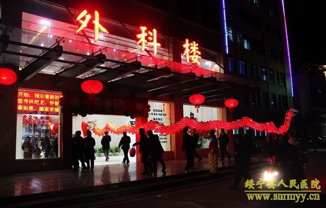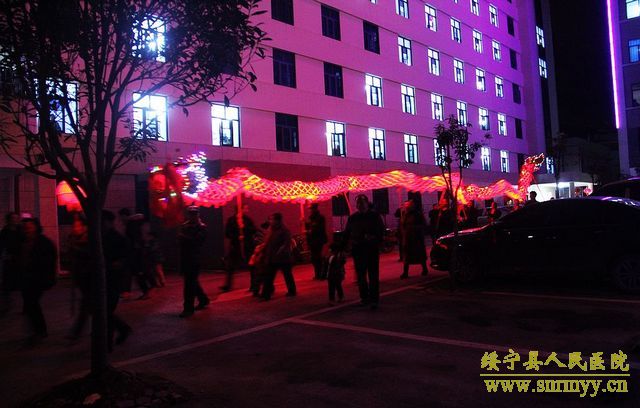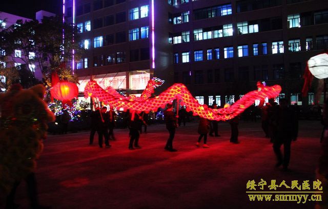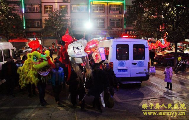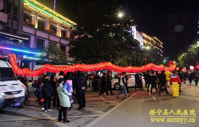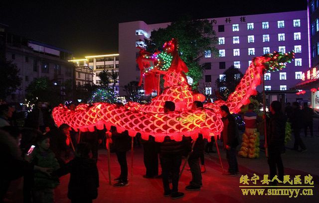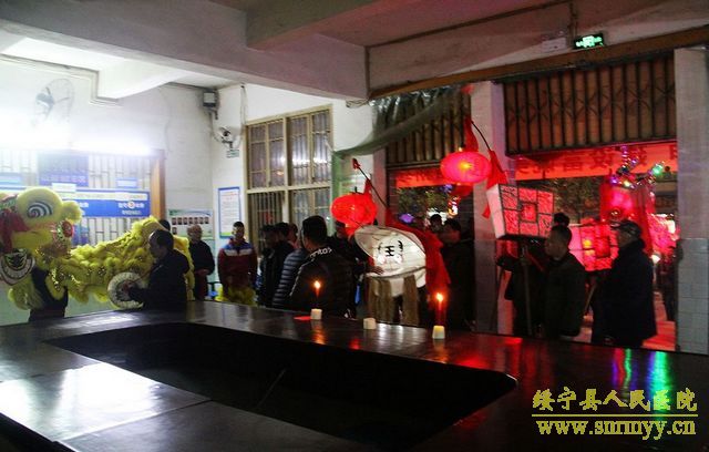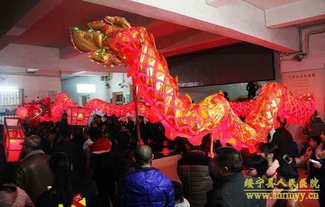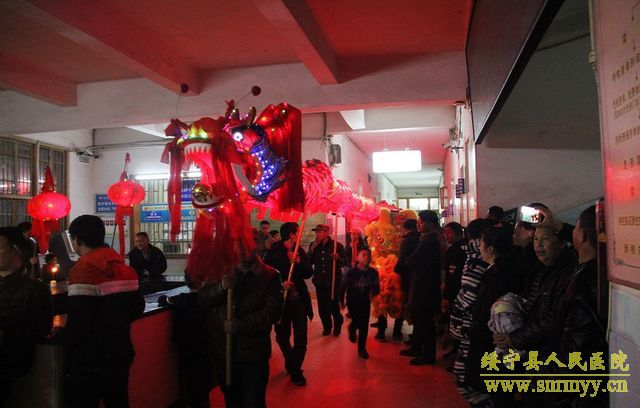 雄狮送来新春祝福 祥龙舞出吉祥如意 皓月当空,锣鼓震天,巨龙飞舞。2月23日晚,绥宁县人民医院彩灯齐明,锣鼓喧天,一条栩栩如生的火红色巨型长龙奔腾于院内,仿佛活着的神龙为新年的绥宁县人民医院带来热烈的祝福。 当晚,县人民医院喜迎龙狮队,按照当地习俗,导诊台前香火袅袅,燃起祥和的气韵。舞龙队精神抖擞舞动龙体,龙随鼓起,翻腾跳跃,热闹非凡,整个医院沉浸在一片喜庆欢快的氛围当中。街区各商家也纷纷参与到虔诚接龙灯活动中来,为新年愿望祈福。接龙灯活动已成为绥宁县传统节目,旨在传递新春祝福,祈求全县人民新的一年红红火火,万事顺意。 这个夜晚,在医院工作的医务人员和病友们,都收获到了各自的快乐——饱眼福,钻龙头,求福报。雄狮送来新春祝福,祥龙舞出吉祥如意。新的一年绥宁县人民医院将奋力前行,乘着大好形势在医疗卫生事业上再续新篇章、再创新辉煌。(责编 铭培)