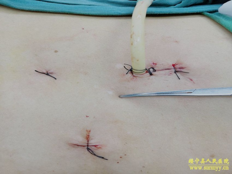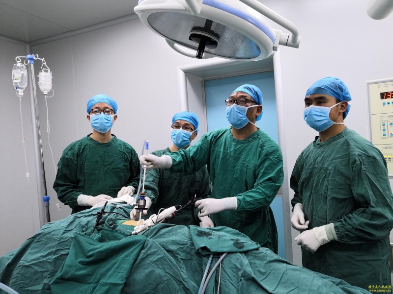 我院完成县内首例腹腔镜下肾切除术 7月24日,我院泌尿外科团队在张华生主任的带领下,成功实施一例腹腔镜下肾切除术,此手术系我院泌尿外科独立完成,属县内首例。这标志着我院腹腔镜手术再上一个新台阶! 患者李某,女,67岁,反复右侧腰痛10余年,一直未经正规检查及治疗,此次再发右侧腰痛5天来我院就诊,经B超检查示右肾重度积水,肾皮质菲薄。住院后泌尿外科医师完善相关检查,发现患者右侧输尿管上段结石梗阻,右肾重度积水无功能,肾皮质最厚处不足2mm,整个肾脏像一个水囊,但患者左肾功能良好,己完全代偿右肾功能。 经科内讨论分析、充分术前准备,于7月24日在腹腔镜下顺利切除右肾,手术过程历时2小时,仅在患者腹壁上开具2个1cm,1个0.5cm的小孔完成手术,术中出血不足10ml。腹腔镜手术的优势在于术中损伤小,出血小,解剖层次更清晰,术后患者恢复快。因腹腔镜手术没有切断患者的肌肉组织,术后对患者的劳动力几乎无影响,这就需要手术医生有扎实的开放手术功底及清晰的解剖理论知识等做基础。目前,患者情况良好,已可下床活动。 图为手术现场 图为手术伤口 结石疾病在我县发病率较高,定期的健康体检是预防结石的有效措施之一。如有腰痛、血尿等症状及时到医院检查,可早期发现病情,及时正确的治疗,防止肾积水加重,肾功能丧失,感染、贫血、肾性高血压的发生!平时多饮水,调整饮食,坚持锻炼,保持良好的乐观心态也可以有效预防结石发生。(图文 付志峰 编辑 雅玲) 泌尿外科主任张华生:13973935246 副主任付志峰:13517397315 科室联系电话:0739-2570858 |