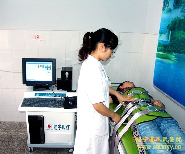 三维多功能牵引床 我院中医科最近引进三维多功能牵引床。该设备由先进的计算机控制,采用最先进的PLC技术,及丹麦和台湾生产的伸缩推力电机,应用拉压、旋转、编码、传感器等高科技技术对牵引力,角度进行严格控制,使脊柱骨伤病治疗达到最科学的水平,全过程均由电脑对牵引力、成角角度、旋转角度、间歇时间、反复频率等进行监控,可纠正椎体间三维方向的病变,恢复腰椎生理弧度,能完成正骨医生用手法不能达到的某些组合动作,并采用悬伸式造型、航空式捆绑、全滚动轴承分离式牵引,实现了人工手法不能达到的三维立体、交替牵引,是治疗腰腿疼痛的理想设备。
