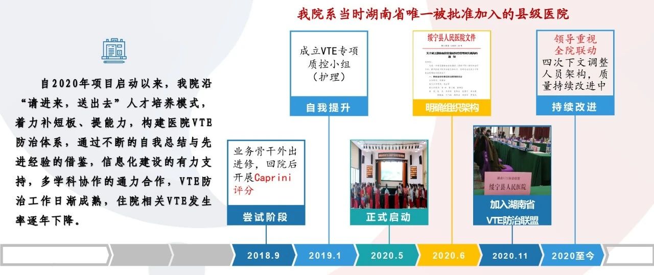 2020年5月21日,绥宁县人民医院正式启动VTE防治能力建设工作。依托湖南VTE防治联盟的鼎力支持,联盟主席单位中南大学湘雅医院贺爱兰等专家的持续指导,院党委高度重视,举全院之力,构建了完善的院内VTE防治体系,规范医院VTE防治临床、质控与信息化建设等管理,全面提升医院VTE防治水平。