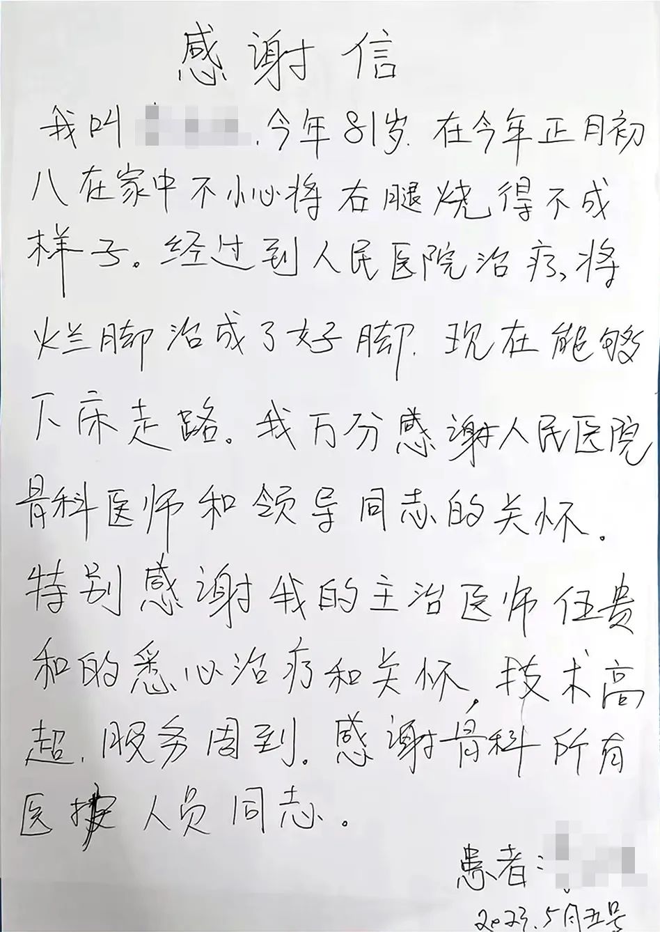 患者入院时的情况 经过入院详细检查,在骨科主任张国宁的带领下,主治医生伍贵和以及骨科团队为李大爷制定了周密的手术计划,于3月11 日安排第一次手术,进行了清创术+VSD引流术,去除焦痂,清除感染组织,恢复新鲜创面,术中发现患者髌骨外露,经过一周左右的VSD引流术,予以拆除引流装置。 第一次手术:清创术+VSD引流术 伍医生每天耐心给患者换药,观察创面情况,等到新鲜肉芽组织长得差不多时,在3月23日进行了第二次手术,行骨水泥填充术+自体皮取皮植皮术,游离皮片成活。 第二次手术:骨水泥填充术+自体皮取皮植皮术,游离皮片成活 虽然其他地方的补皮已经成功,但是李大爷膝盖处烧伤最严重,已经伤及骨头,仍是一大难题。伍医生立即请到他在南华附一进修的老师过来会诊,考虑给李大爷进行皮瓣移植术,精心设计手术方案,完善相关准备后,于4月15日为李大爷行股前外侧带蒂皮瓣逆行转移修复术,也就是从一侧大腿取一块带蒂皮瓣,转移到患者膝盖处,重新建立新的血运循环,使皮瓣成活。 第三次手术:股前外侧带蒂皮瓣逆行转移修复术 治疗期间,医护人员时不时去观察皮瓣情况,得知李大爷家庭困难,护士长立即给李大爷送去高蛋白牛奶,医生也自掏腰包送去慰问金,希望其早日康复。皮瓣血运良好,皮瓣移植成功,李大爷一天天好起来,也能下床走路了,脸上也露出了久违的笑容。 护士长给李大爷送去高蛋白牛奶 医生自掏腰包送去慰问金,李大爷感动得热泪盈眶 经过精心护理,李大爷皮瓣血供良好,伤口愈合良好。经过主治医生评估,于5月6日顺利出院,李大爷对手术治疗效果非常满意,对医护人员辛勤付出十分感激,便就有了开头送锦旗及感谢信的一幕。  |