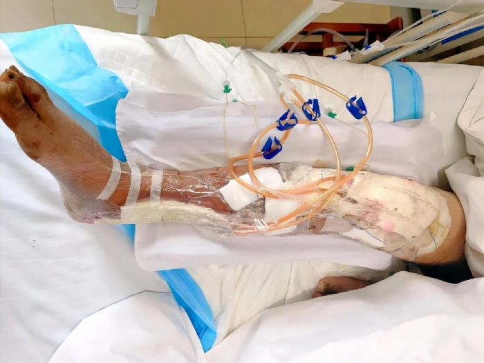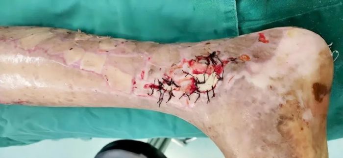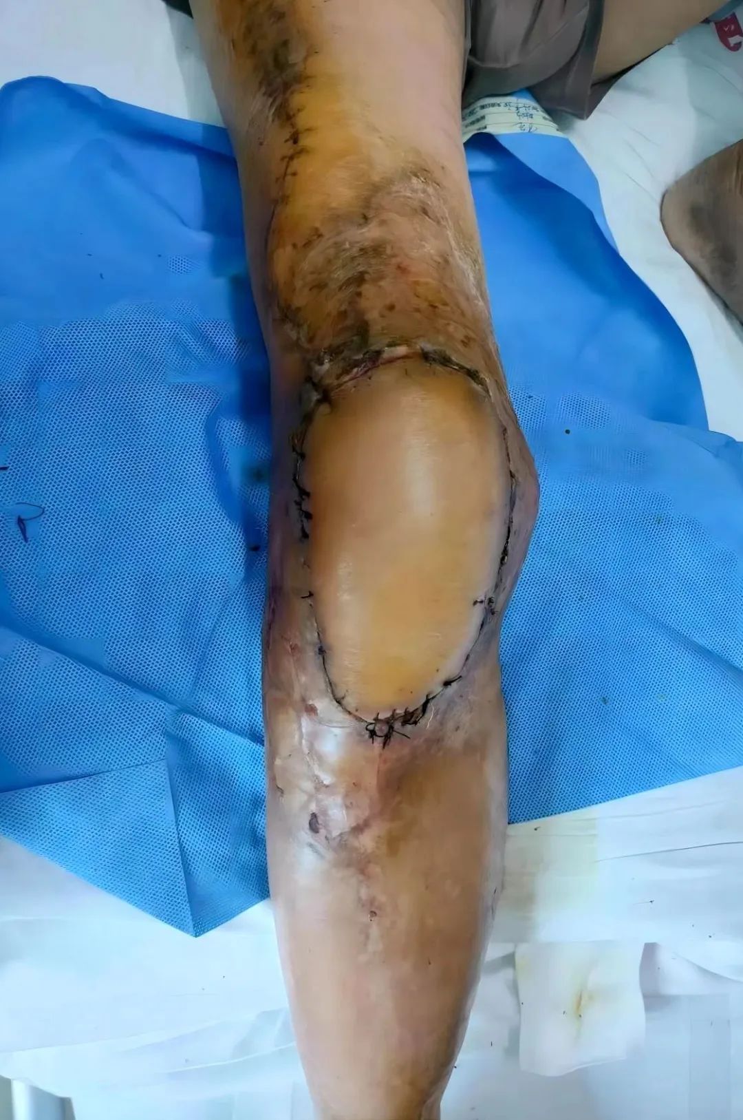 “谢谢你们,你们救了我一条腿,我本以为这条腿要锯掉了。”近日,一位李大爷拿着一面锦旗和一封感谢信,蹒跚着走到绥宁县人民医院骨科医生办公室,激动地说道。 这究竟是怎么一回事呢?↓↓↓ “移花接木”“嫁衣神功”,似乎只是武侠小说里的招数,但绥宁县人民医院骨科团队巧施皮瓣移植手术修复了李大爷血肉模糊的右腿。 故事要从3月9日说起,当天上午,81岁的李大爷坐着轮椅被送到了绥宁县人民医院骨科,右腿被严重烧伤,右大腿约有6%的三度烧伤,右下肢肿胀明显,伤处都是黑色焦痂,医护人员立即安排入院治疗。李大爷自诉在家不慎被火烧伤,因为没引起重视,自行在家敷草药,不见好转便又在当地诊所进行输液治疗,但一月余仍没有好转。邻居看到李大爷腿越来越严重,便劝说并带着李大爷来到我院就诊。 (图片可能引起不适,请谨慎观看)