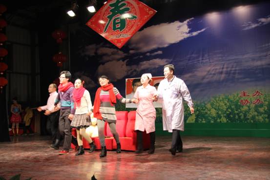 本次晚会历时1个多小时,现场气氛热烈,精彩纷呈;节目形式多样,包含了歌舞、快板、二胡演奏、二人转、小品、幕布戏。晚会首先以一曲藏族风情的开场舞《吉祥》热烈而直白的向在座的医院干部职工传递出浓浓的新春祝福。小品《幸福的一家》以孩子的视角,深情演绎了医务工作者的家人对其从抱怨到期盼再到理解与支持的心理转变过程,引得在场观众眼含湿意,一片温情。“十二金钗”的《白衣天使谱新编》节目以快板的形式描述了医院2011年所取得的各项工作成果。晚会现场大屏幕同步滚动的影像播放,在视觉和效果上堪比完美。俗话说英雄出少年,两位医院子弟的二胡演奏《喜气洋洋》流畅灵动,以跳跃的音符把喜悦描上了观众的眉梢。晚会高潮来自总务科的《迎春接福》,该剧为滑稽幕布戏,两位演员以其夸张的造型,反串的特色,逗趣的台词,以纤夫的爱、龙船调、Nobody、恭喜发财这些脍炙人口歌曲的串烧、表演惹得笑声不断,掌声连连。最后,晚会在《朋友干杯》中划上了欢乐、祥和的句号。