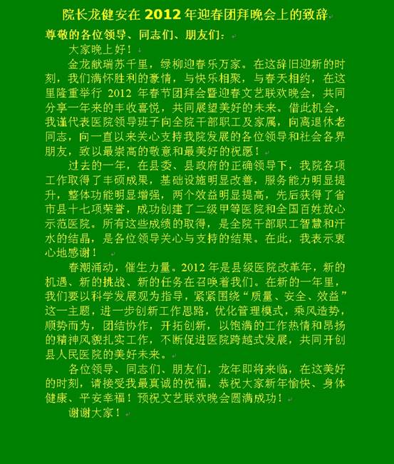 在浓烈的团拜晩会气氛中,县卫生局副局长、县人民医院院长龙健安首先代表医院领导班子新年致辞。他首先向全体干部职工致以新春问候,随后在总结医院2011年所取得的工作成果的同时,对全院职工为这些成果的取得所付出的无限努力以及无私奉献表达深切谢意,同时,展望未来对2012年提出了服务能力提升年的要求。随后,县委宣传部部长黄俊玲致新春贺词。她首先肯定了2011年是医院全面进步、硕果累累的一年,并期待医院2012年在开拓创新的基础上紧紧围绕“服务好,质量好,医德好,群众满意”的三好一满意活动主题,深入、扎实、有力、有序、有效地开展各项工作。