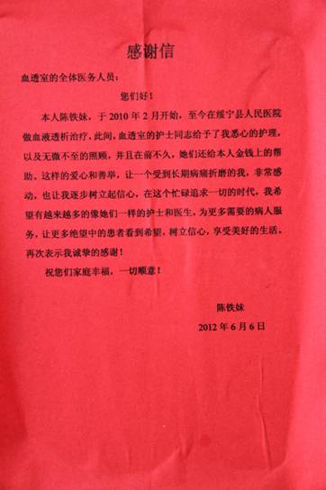 编者按:有一类人,她们有着纯洁的心灵,高尚的情操;默默奉献是无怨的追寻,救死扶伤是无悔的选择;只求奉献不求回报,有着像海一样博大的情怀。如春天的雨露滋润患者久旱的心田;如夏天的清风吹走燥热带走患者的忧伤;如秋夜爽朗的明月照亮患者晦暗的灵魂;如冬日温暖的阳光呵护着患者的心灵。她们不仅仅是“白衣天使”,更是“爱的天使”! 走入血液净化中心,护士们忙碌却不失耐心与细致,不时能听到患者及等候的家属向护士们说“你们的服务态度真是太好了”、“真是辛苦你了”、“谢谢”等亲切的话语。护士以病人为亲人式的高质服务,患者脸上绽放着的理解的笑容,和谐的温馨盈满这肃然的透析室,也就不奇怪为什么有了下面这封感谢信: (编辑:文娟)