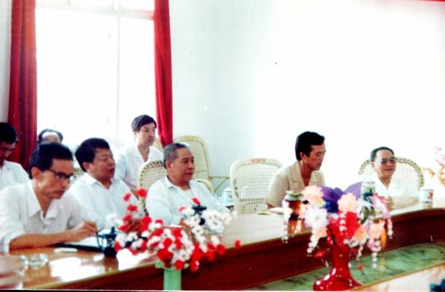 图为院长石柏青在向市、县领导汇报工作。前排右一为当时的副县长黄金榜、右二为院长石柏青、右三市中心医院院长呙湘涛、右四为县卫生局局长袁成福、右五市卫生局局长刘君武。该片摄于80年代末。