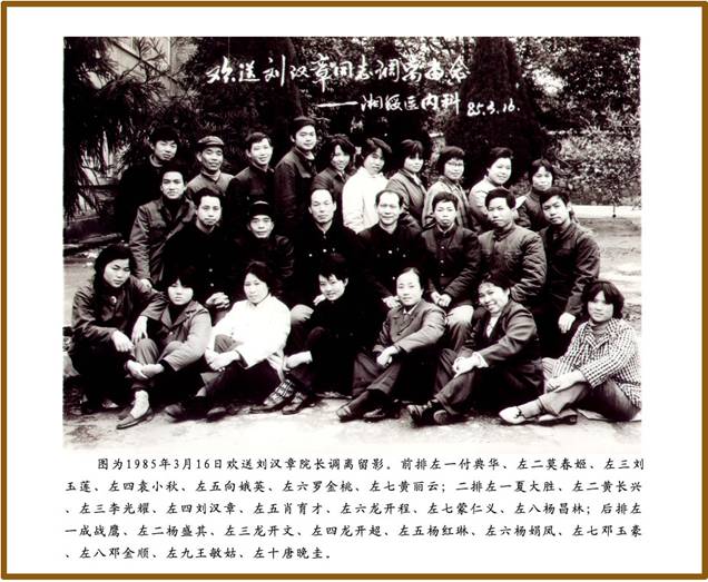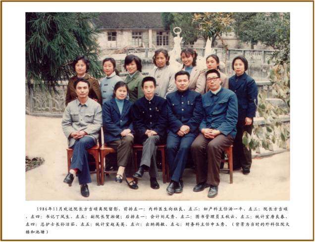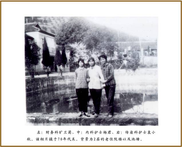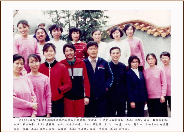 图为1989年3月我院代表队参加全县健美操比赛荣获三等奖的队员。前排左一阳慧娟、左二王秋云、左三丁丹林、后排左一郑珍、左二赵美英、左三揭敏、左四刘付秀、左五袁彬、左六简曼芳、左七杨红林。这些当年的院花、文艺骨干,有的现在已经光荣退休,有的早已升任调离,仍在医院工作的也已经成为副院长或科室带头人,如今已是很难再齐聚一堂,共话当年。