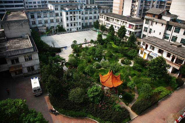图为:花园右前方为原制剂楼。现在的院落里没有留下制剂楼存在过的痕迹,原址上6层的现代化医技楼已经投入使用。