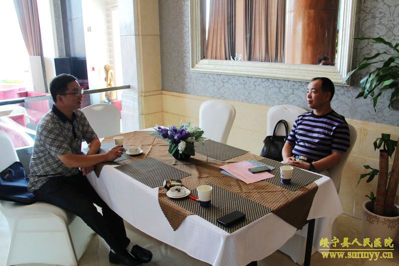 图为:院长龙健安利用会休时间与石门县人民医院党总支书记唐志远进行经验交流