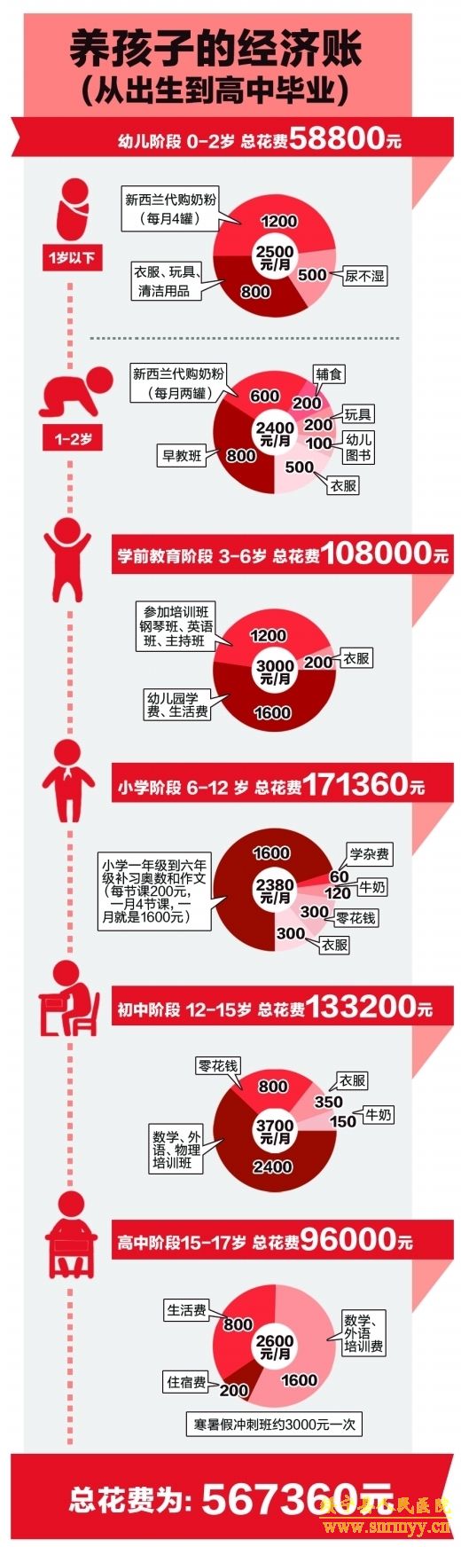 一张图片解读养孩子的经济账 单独两孩来啦,不过高昂的抚养费又让不少夫妻头疼,我生得下来,但养得起吗? 随着单独两孩时代的到来,想生第二个宝宝的父母们在心里默默算账,从孕育宝宝,到孩子出生,到开始念书,最后到大学毕业,每一阶段,到底花多少钱?这些钱具体又花在了哪些地方? 看看下面这张大图,我们从几个家庭孩子的花费,来估算一下现今生二娃将会花多少钱。 将孩子的成长分为幼儿阶段、学前教育阶段、小学阶段、初中阶段、高中阶段,再分别采访了几个家庭,把他们的孩子在不同阶段所花的费用综合起来,算出了一个孩子从出生到高中毕业,所花费的经济账单。 也有父母们预计,第二个孩子可以不用花第一个宝宝那么多钱,因为婴儿车、衣服、婴儿床、保姆等很多资源,两个孩子都是可以共享的。但是已有两孩的家长却坦言,两个孩子后,在教育和精力这块投入却是原来的双倍。 |